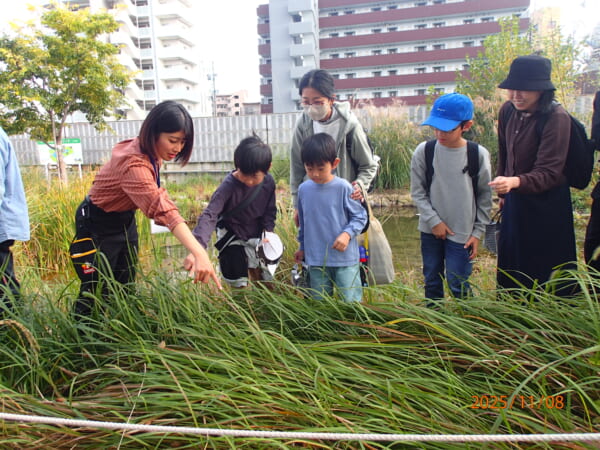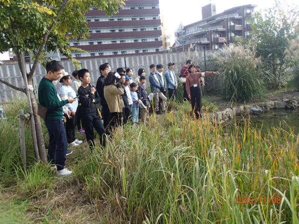 職員と一緒にビオトープの生きものを観察する様子