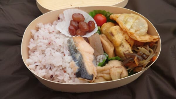 現地に着くとまずはお昼ご飯。伊藤さんプロデュースの曲げわっぱに、地元の食材がたっぷり詰まったお弁当をいただきました。下呂市の地元の水と、名古屋市の災害用備蓄飲料水「名水」の飲み比べも行いました。