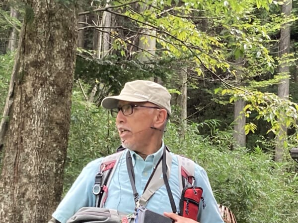 バスの道中や現地で案内してくださったのは、NPO法人森のなりわい研究所の伊藤栄一さん。片道約140kmの道のりを、飛騨川沿いの景色を眺めながら上流へ向かって進みます。名古屋で育ち、下呂市に長年住んでいる伊藤さん自身の経験を踏まえながら、車窓から見える土地の歴史や植生の移り変わりなどのお話を伺いました。