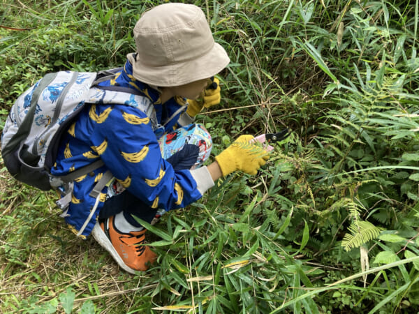 続いては、会場の隣にある森で簡単な森林保全体験行いました。元々はスギやヒノキが植えられた人工林で、管理上、自然に生えてきた草木は取り除く必要があります。ですが、今後は生物多様性に配慮した森に変えていこうと方向転換し、自然に生えてきた草木も一部残すということを試験的に行っているそうです。そこで、他の草木の成長を遮ってしまう笹などの下草刈りを行いました。人工林か自然林のどちらかではなく、グラデーションのような森づくりにより、生物多様性の豊かさを守るという取り組みです。林業が盛んであった時代と比べ、人と森の関わり方が変わってきており、柔軟に考える必要があると感じました。