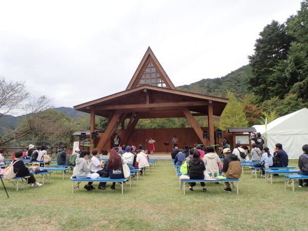 お腹が満たされたところで、現地で開催されている「下呂市みどりの祭」のステージイベントを見学。ヨーデル(アルプス地方の伝統音楽)を聴きながら、伊藤さんの森のお話を楽しみました。間伐材を活用して作られた楽器、アルプホルンも登場。バスツアー参加者の中から2名の方が挑戦し、素敵な音色が響いていました。