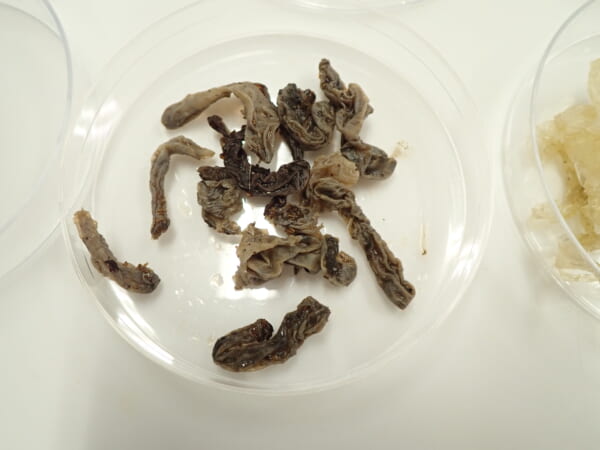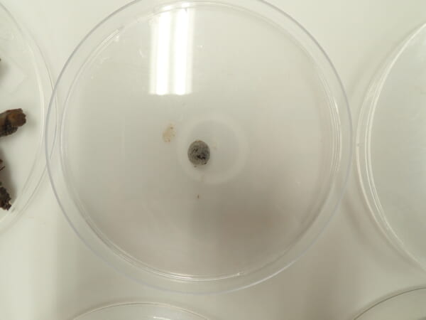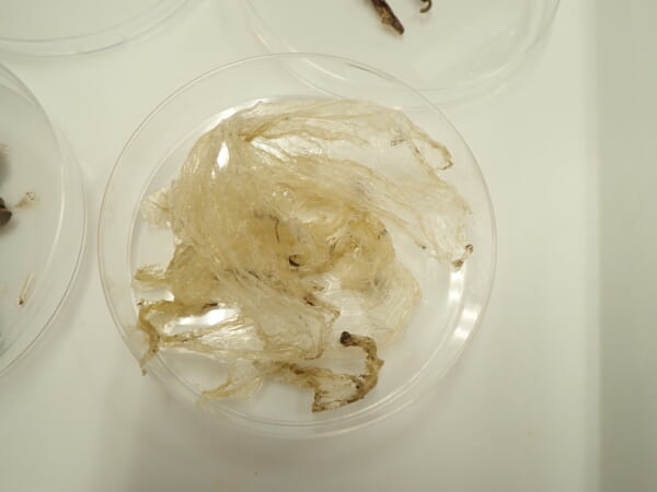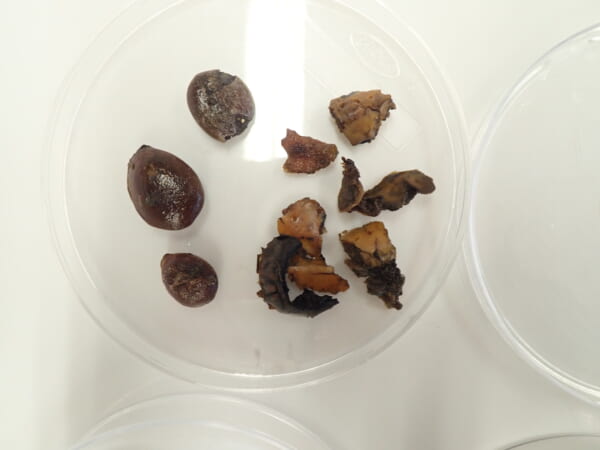 その結果、イモムシ型の幼虫、カキノキの種子と外皮、ムクノキの種子、加えてビニール袋が見つかりました。