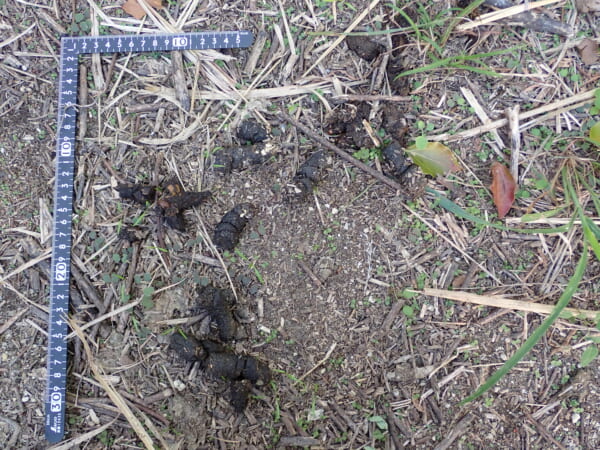 寒くなりだした10月末、ビオトープに棒状のフンがまとまってあるのを発見しました。