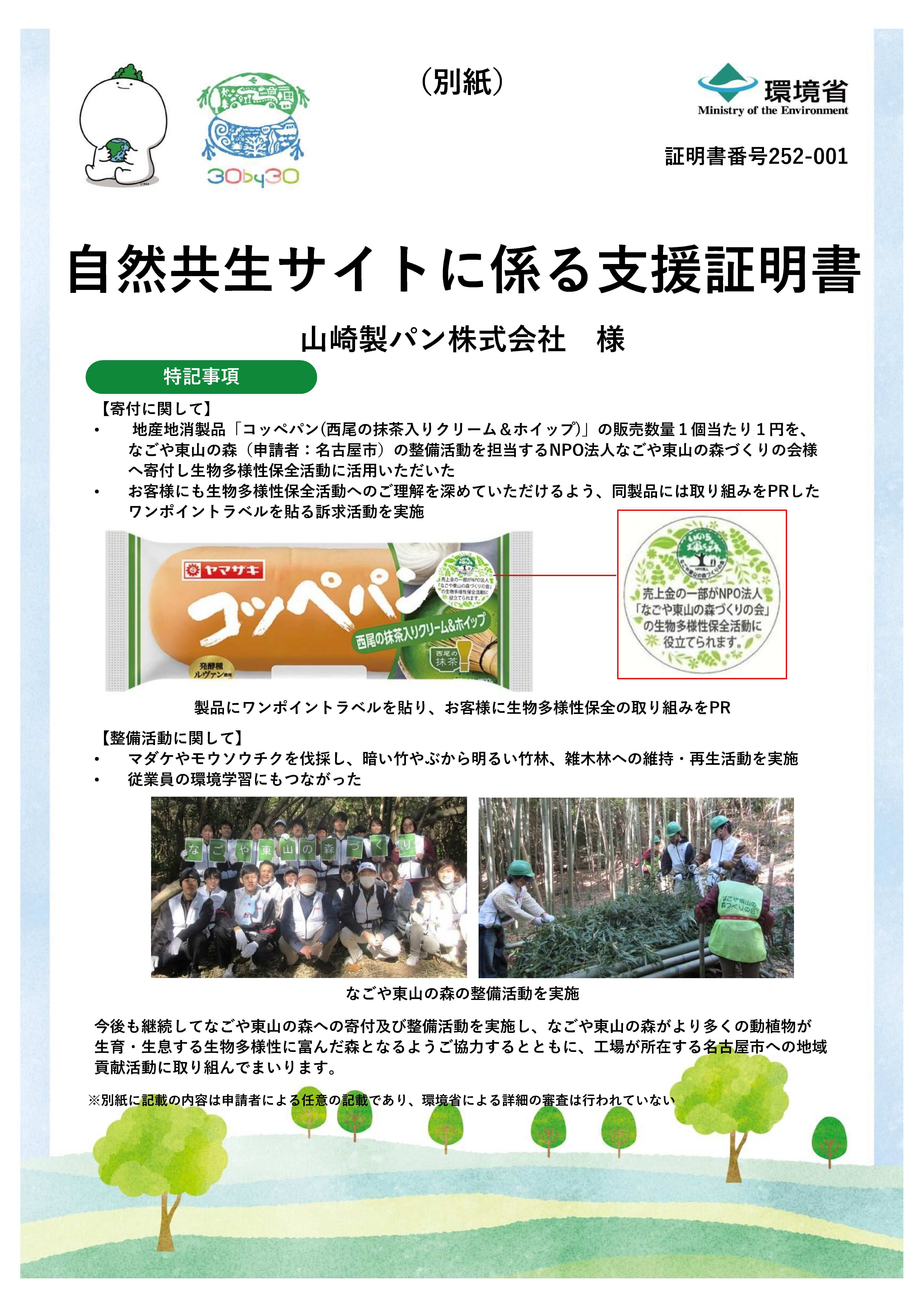 自然共生サイト「なごや東山の森」への支援活動が、環境省から同サイトの生物多様性の維持・向上に資すると認定され、2026年3月 食品メーカーで初めて「自然共生サイトに係る支援証明書」を取得しました。 ※支援証明書は環境省HPをご確認ください https://policies.env.go.jp/nature/biodiversity/30by30alliance/